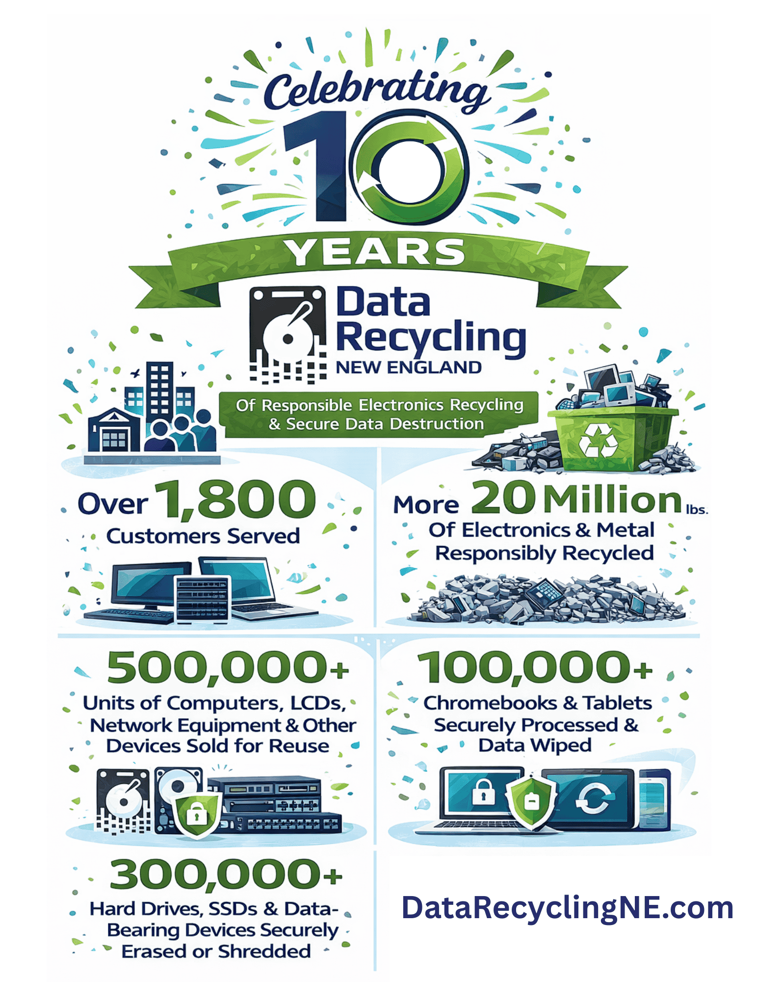 Celebrating 10 Years of Secure Electronics Recycling Ten years ago, we started Data Recycling of New England with a simple goal: to provide organizations with a secure and responsible way to recycle electronics while protecting sensitive data. From the beginning, our...